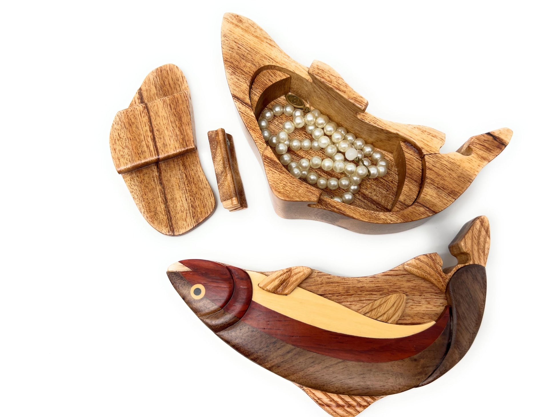 Handcrafted Rainbow Trout Wood Puzzle Box, All-Natural Wood Intarsia Art with Secret Compartment